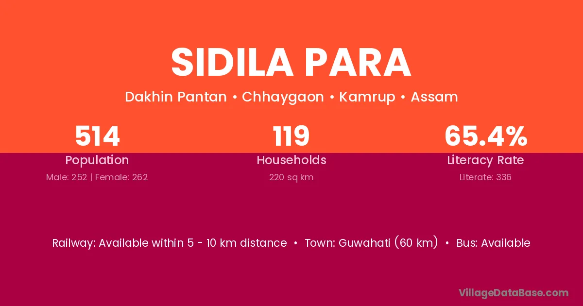 Guwahati (60 km) is the nearest town to Sidila Para village for major economic activities and is located approximately 60 km away.