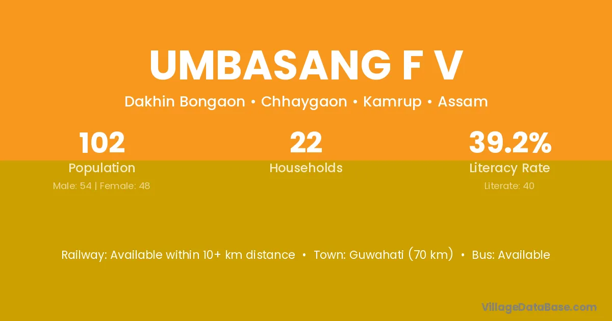 Guwahati (70 km) is the nearest town to Umbasang F V village for major economic activities and is located approximately 70 km away.