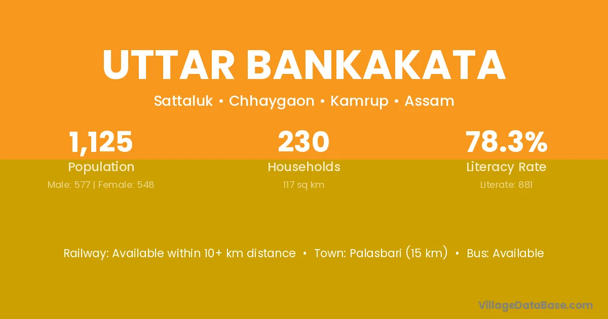 Palasbari (15 km) is the nearest town to Uttar Bankakata village for major economic activities and is located approximately 15 km away.