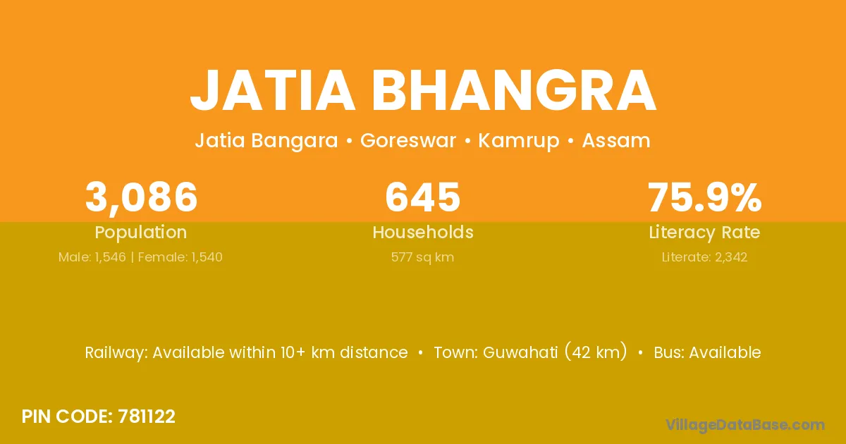 Guwahati (42 km) is the nearest town to Jatia Bhangra village for major economic activities and is located approximately 42 km away.