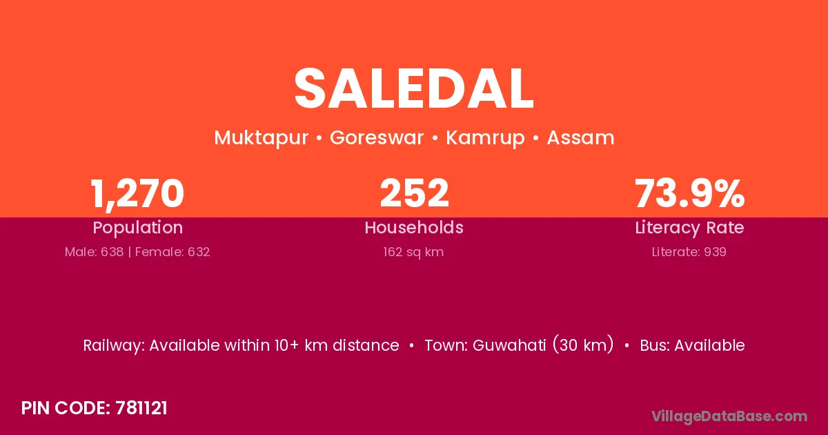 Guwahati (30 km) is the nearest town to Saledal village for major economic activities and is located approximately 30 km away.