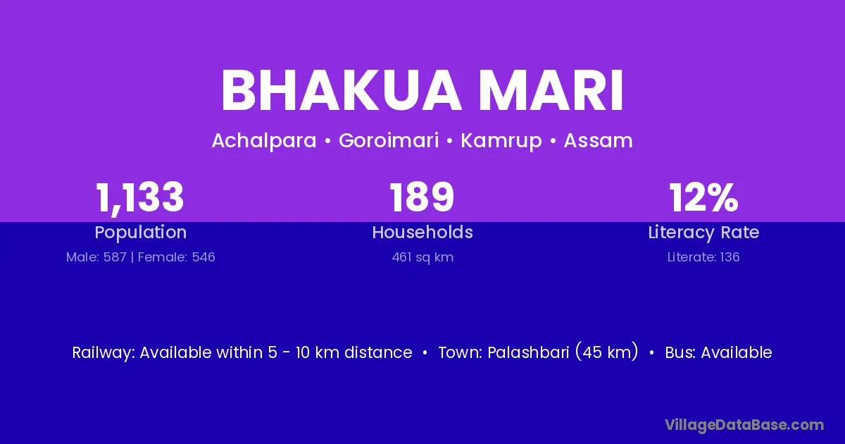 Palashbari (45 km) is the nearest town to Bhakua Mari village for major economic activities and is located approximately 45 km away.