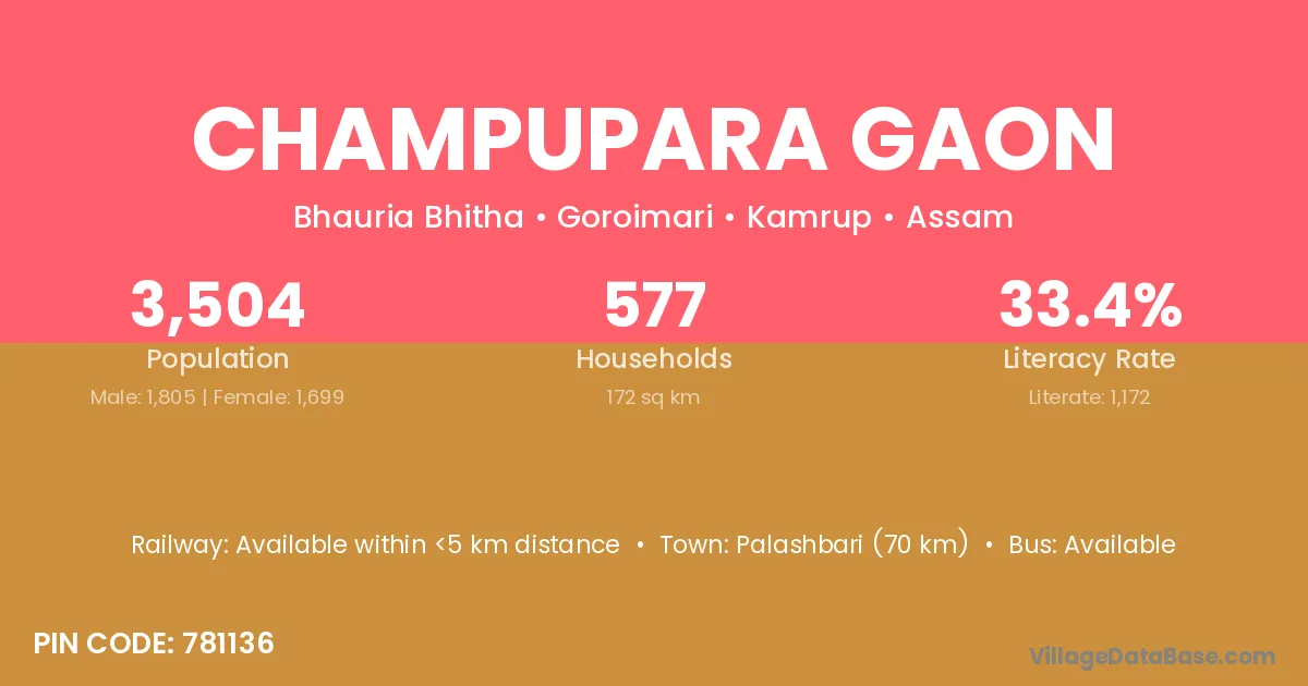 Palashbari (70 km) is the nearest town to Champupara Gaon village for major economic activities and is located approximately 70 km away.
