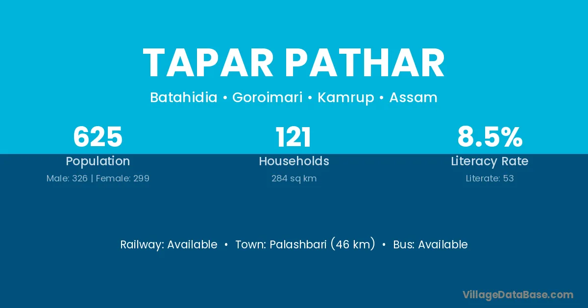 Palashbari (46 km) is the nearest town to Tapar Pathar village for major economic activities and is located approximately 46 km away.