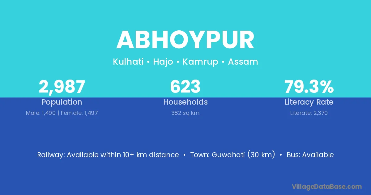 Guwahati (30 km) is the nearest town to Abhoypur village for major economic activities and is located approximately 30 km away.