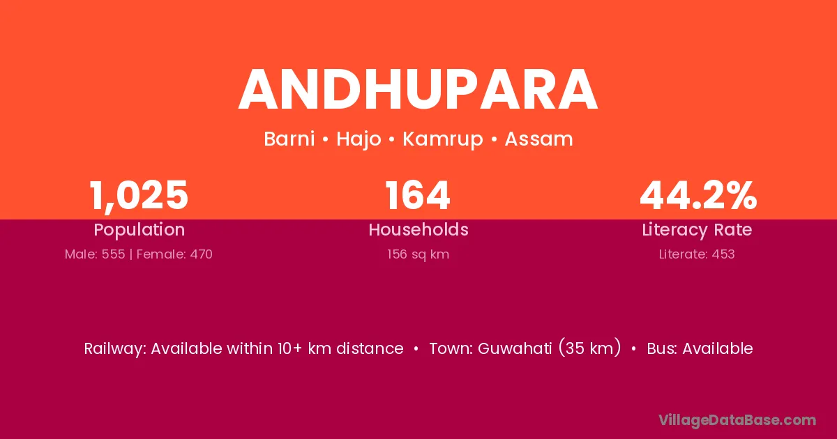 Guwahati (35 km) is the nearest town to Andhupara village for major economic activities and is located approximately 35 km away.