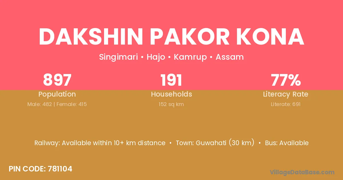 Guwahati (30 km) is the nearest town to Dakshin Pakor Kona village for major economic activities and is located approximately 30 km away.