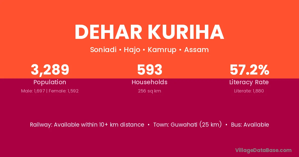 Guwahati (25 km) is the nearest town to Dehar Kuriha village for major economic activities and is located approximately 25 km away.