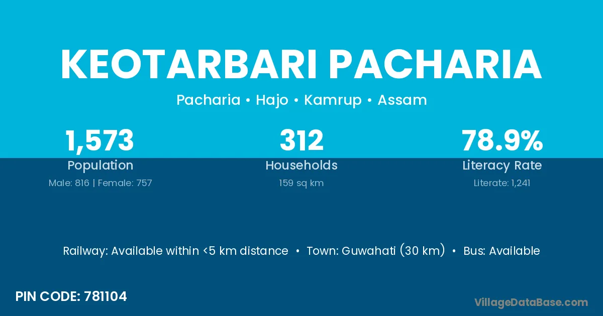 Guwahati (30 km) is the nearest town to Keotarbari Pacharia village for major economic activities and is located approximately 30 km away.