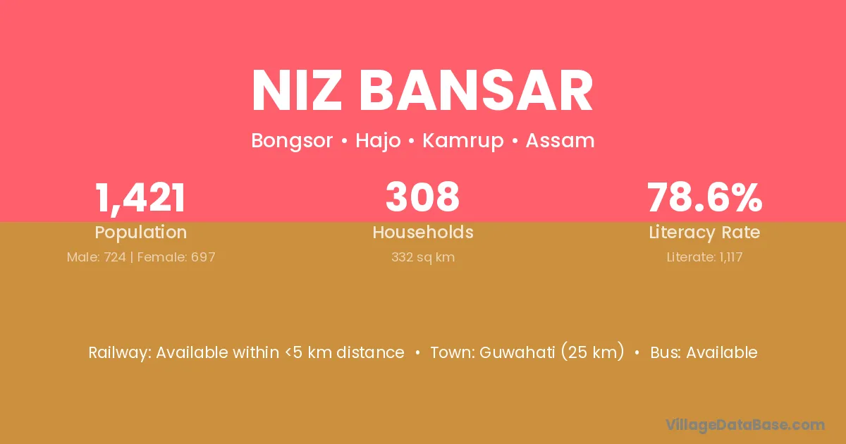 Guwahati (25 km) is the nearest town to Niz Bansar village for major economic activities and is located approximately 25 km away.