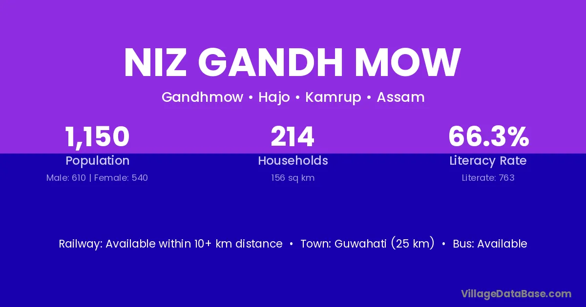 Guwahati (25 km) is the nearest town to Niz Gandh Mow village for major economic activities and is located approximately 25 km away.