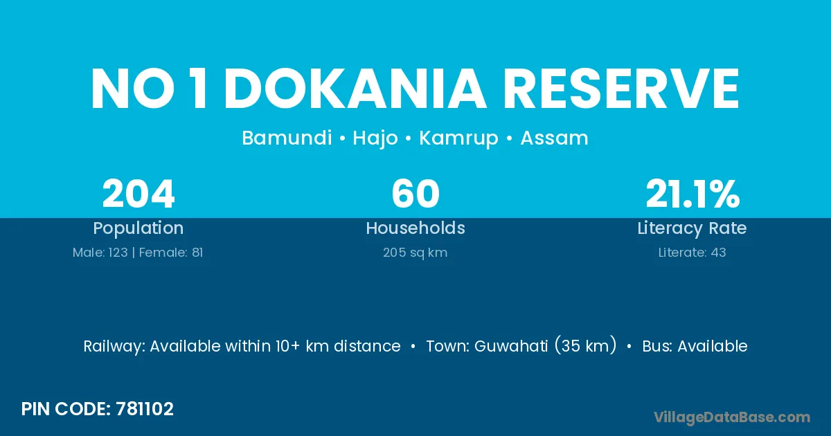 Guwahati (35 km) is the nearest town to No 1 Dokania Reserve village for major economic activities and is located approximately 35 km away.