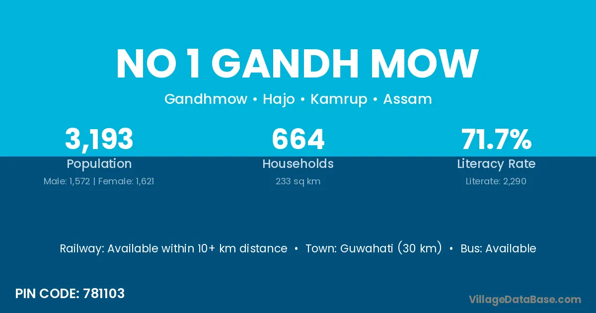 Guwahati (30 km) is the nearest town to No 1 Gandh Mow village for major economic activities and is located approximately 30 km away.