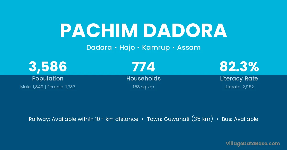 Guwahati (35 km) is the nearest town to Pachim Dadora village for major economic activities and is located approximately 35 km away.