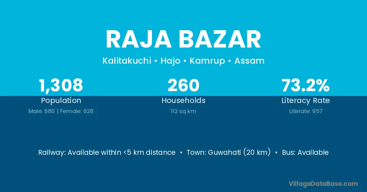Guwahati (20 km) is the nearest town to Raja Bazar village for major economic activities and is located approximately 20 km away.