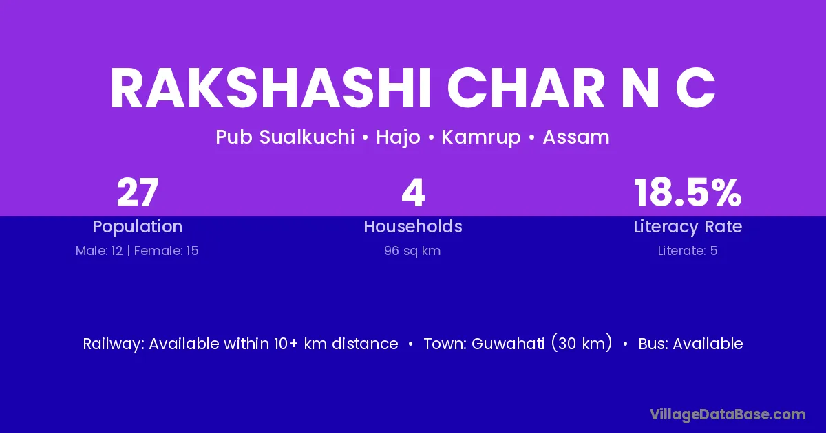 Guwahati (30 km) is the nearest town to Rakshashi Char N C village for major economic activities and is located approximately 30 km away.