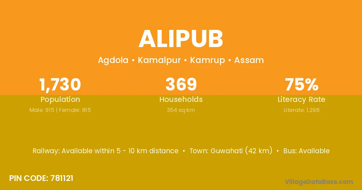 Guwahati (42 km) is the nearest town to Alipub village for major economic activities and is located approximately 42 km away.