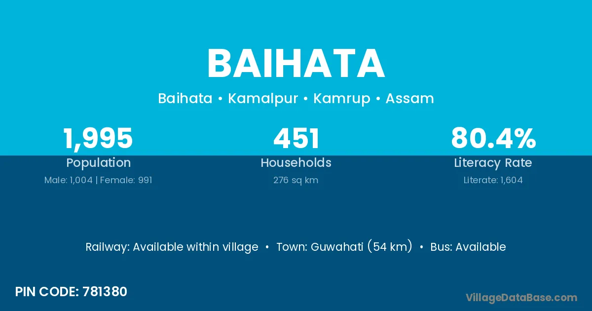 Guwahati (54 km) is the nearest town to Baihata village for major economic activities and is located approximately 54 km away.