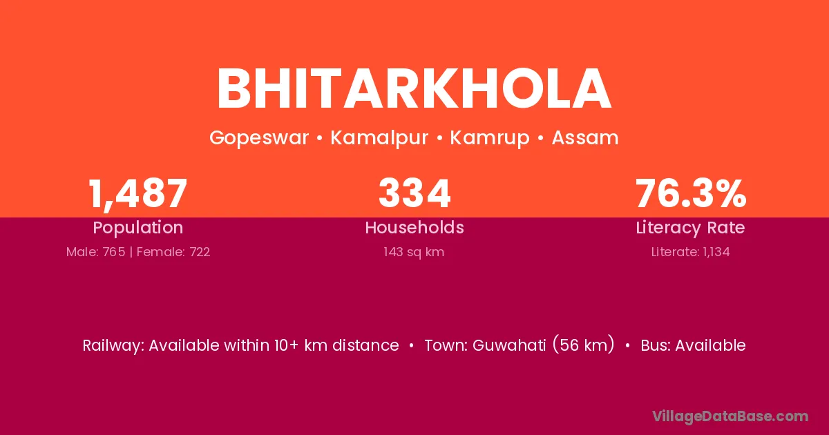 Guwahati (56 km) is the nearest town to Bhitarkhola village for major economic activities and is located approximately 56 km away.