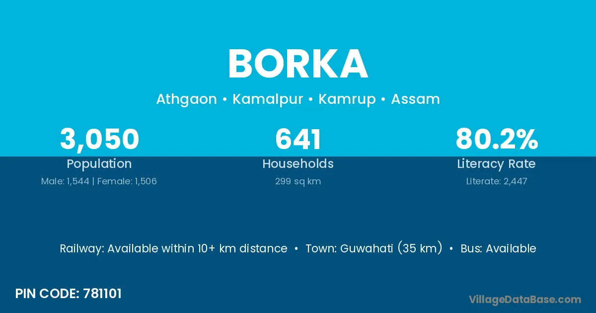 Guwahati (35 km) is the nearest town to Borka village for major economic activities and is located approximately 35 km away.