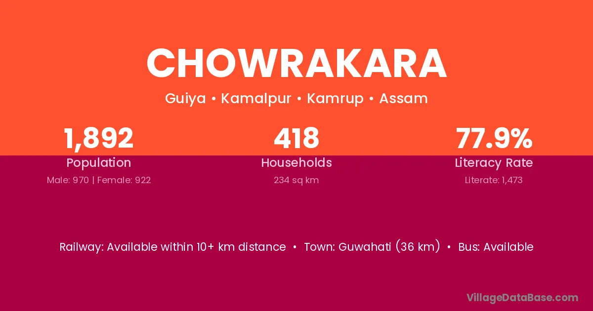 Guwahati (36 km) is the nearest town to Chowrakara village for major economic activities and is located approximately 36 km away.
