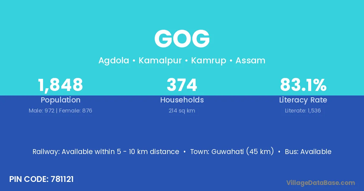Guwahati (45 km) is the nearest town to Gog village for major economic activities and is located approximately 45 km away.