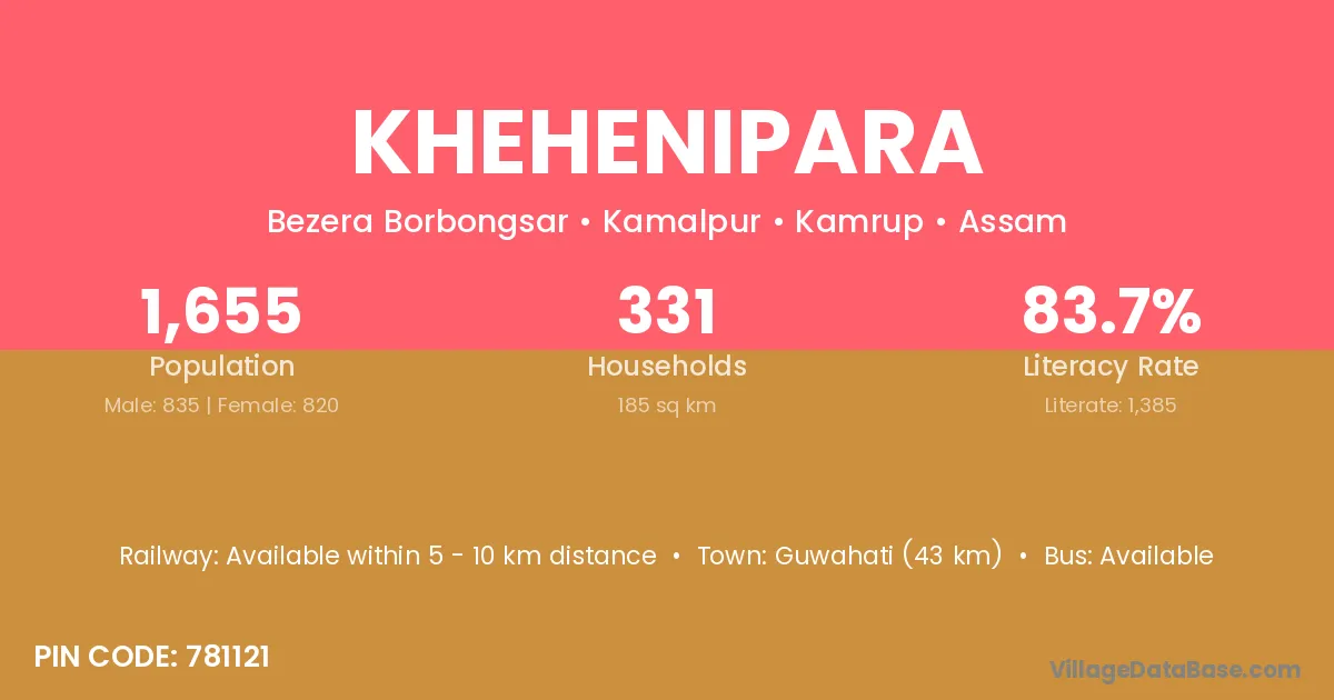 Guwahati (43 km) is the nearest town to Khehenipara village for major economic activities and is located approximately 43 km away.