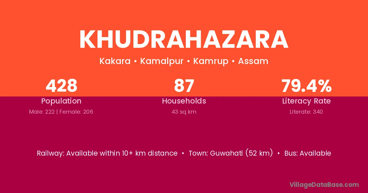 Guwahati (52 km) is the nearest town to Khudrahazara village for major economic activities and is located approximately 52 km away.