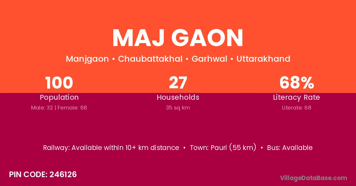 Maj Gaon village has a total population of 1,190 people, of which 604 are males and 586 are females.