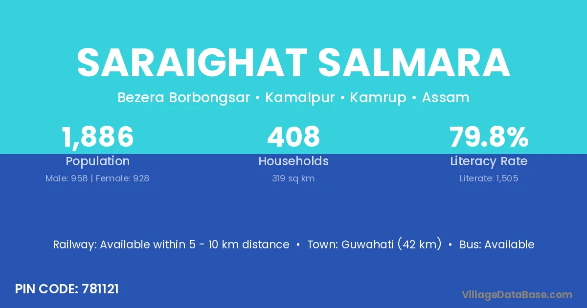 Guwahati (42 km) is the nearest town to Saraighat Salmara village for major economic activities and is located approximately 42 km away.