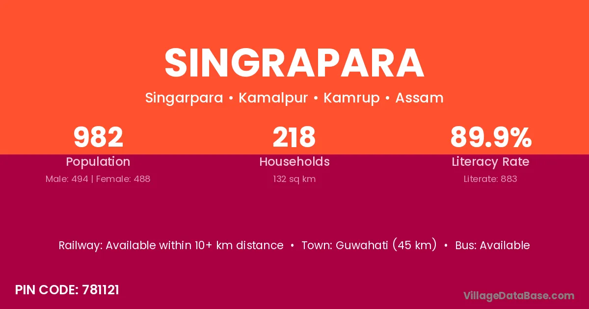 Guwahati (45 km) is the nearest town to Singrapara village for major economic activities and is located approximately 45 km away.
