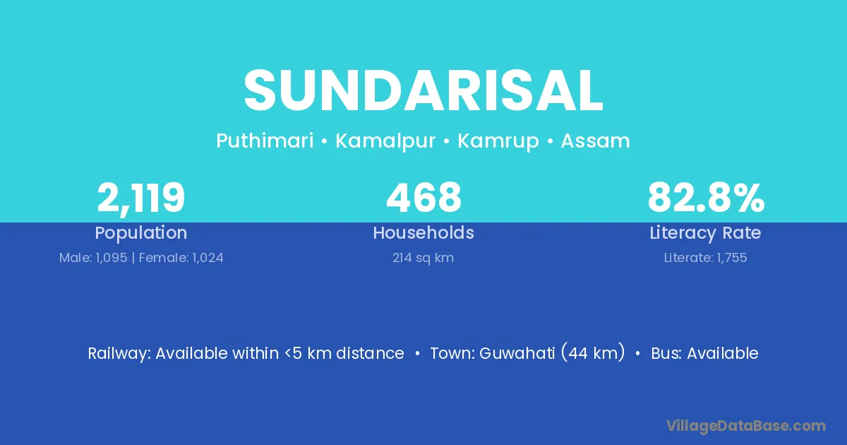 Guwahati (44 km) is the nearest town to Sundarisal village for major economic activities and is located approximately 44 km away.