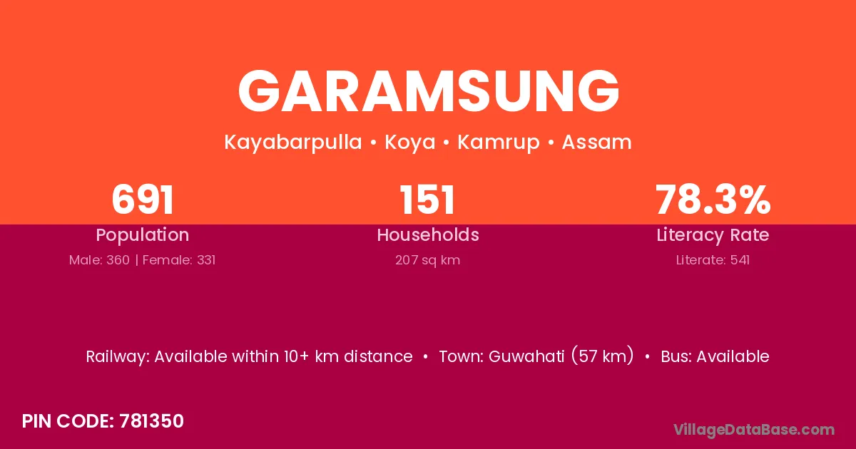 Guwahati (57 km) is the nearest town to Garamsung village for major economic activities and is located approximately 57 km away.