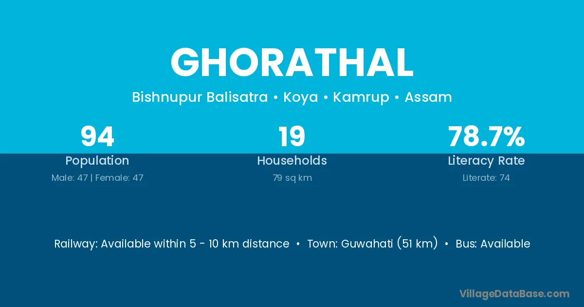 Guwahati (51 km) is the nearest town to Ghorathal village for major economic activities and is located approximately 51 km away.