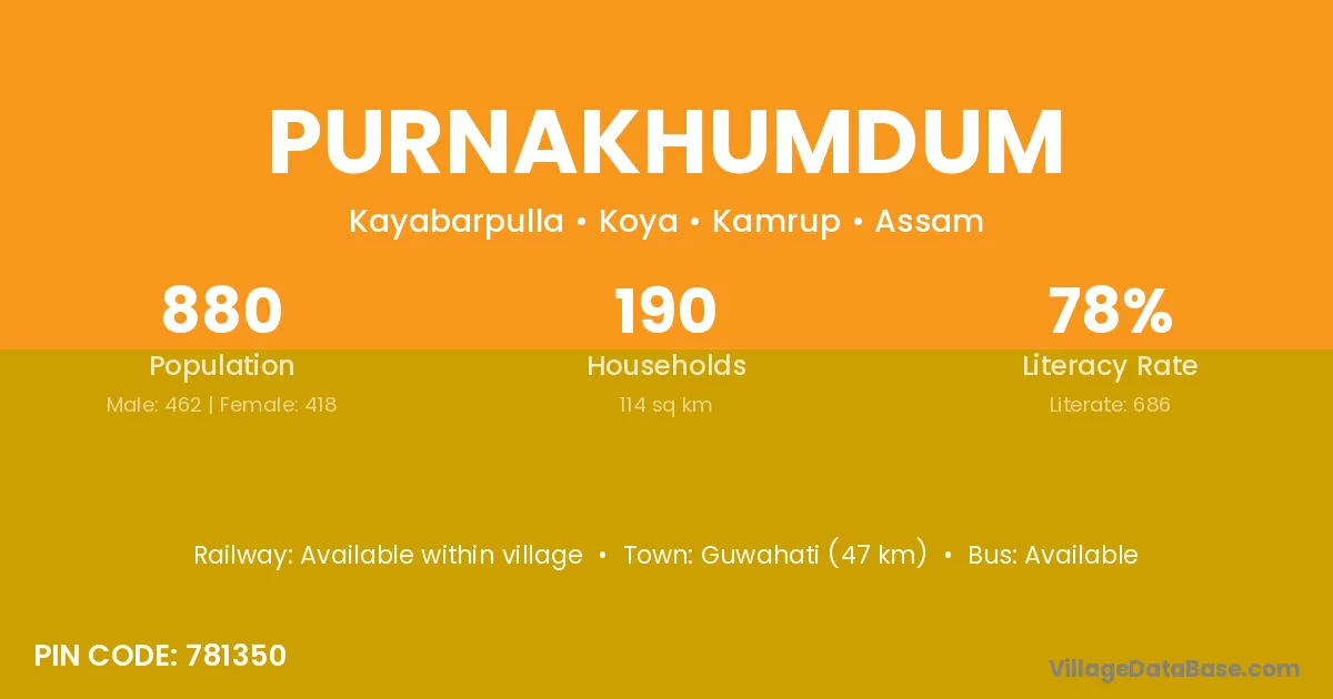 Guwahati (47 km) is the nearest town to Purnakhumdum village for major economic activities and is located approximately 47 km away.
