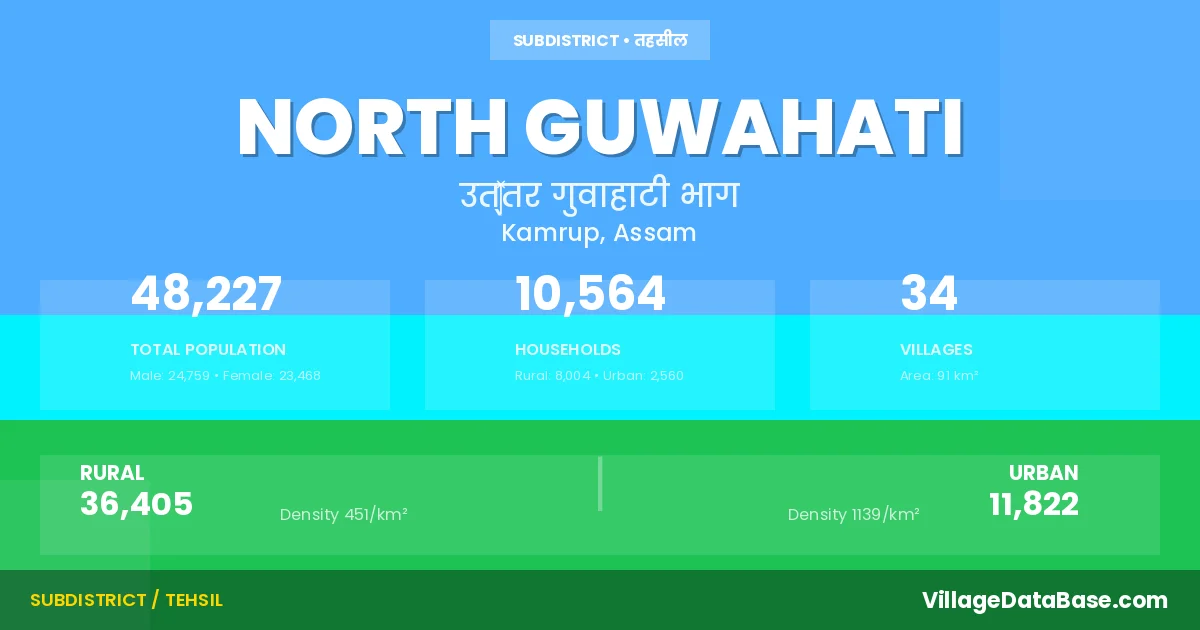 According to the 2011 census The total area of North Guwahati Subdivision is 91 km², with a population of 48227 people. The population density is 530 inhabitants per square kilometre, and there are approximately 10564 houses in the sub district.