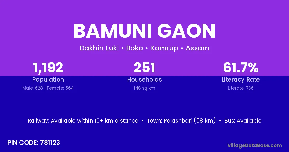Guwahati (25 km) is the nearest town to Bamuni Gaon village for major economic activities and is located approximately 25 km away.