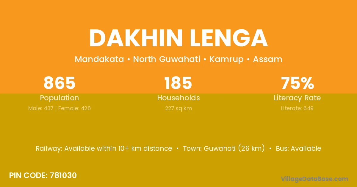 Guwahati (26 km) is the nearest town to Dakhin Lenga village for major economic activities and is located approximately 26 km away.