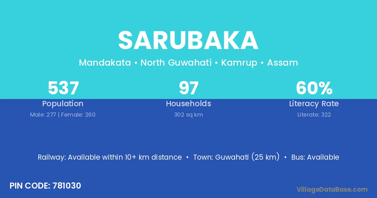 Guwahati (25 km) is the nearest town to Sarubaka village for major economic activities and is located approximately 25 km away.