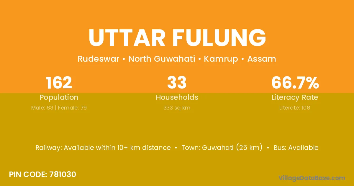 Guwahati (25 km) is the nearest town to Uttar Fulung village for major economic activities and is located approximately 25 km away.