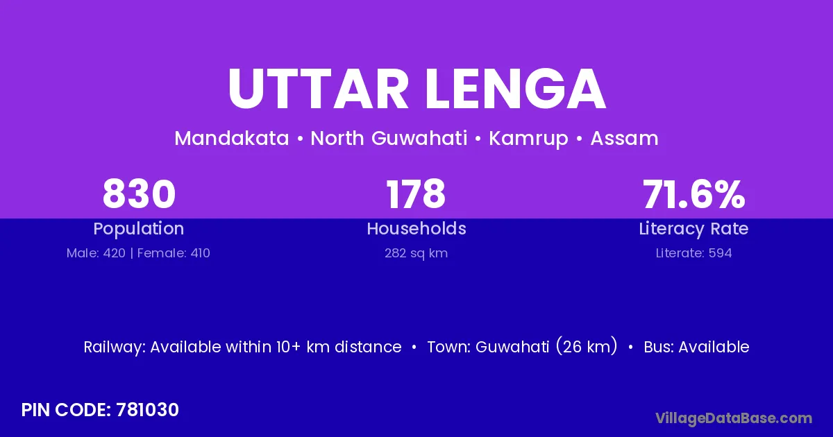 Guwahati (26 km) is the nearest town to Uttar Lenga village for major economic activities and is located approximately 26 km away.