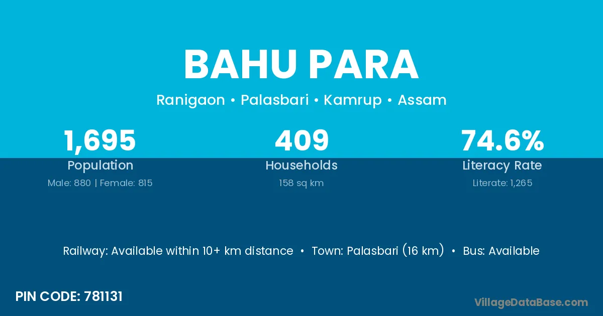 Palasbari (16 km) is the nearest town to Bahu Para village for major economic activities and is located approximately 16 km away.