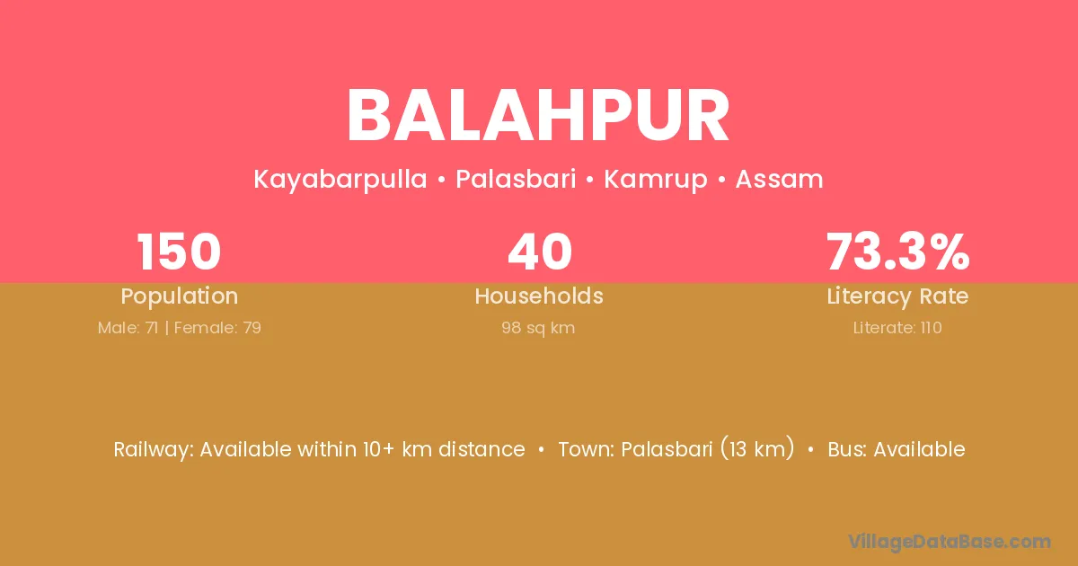 Palasbari (13 km) is the nearest town to Balahpur village for major economic activities and is located approximately 13 km away.
