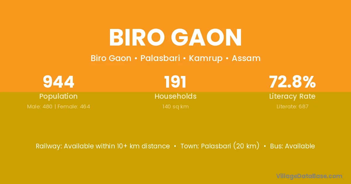 Palasbari (20 km) is the nearest town to Biro Gaon village for major economic activities and is located approximately 20 km away.