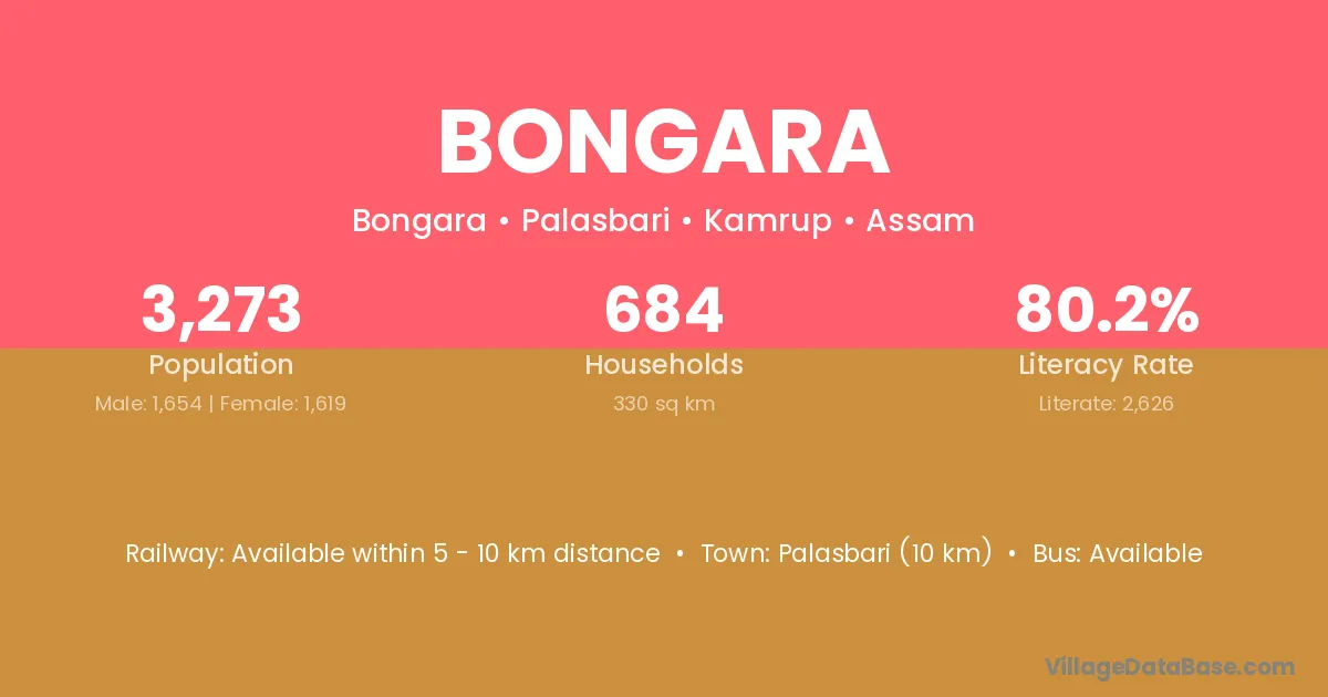 Palasbari (10 km) is the nearest town to Bongara village for major economic activities and is located approximately 10 km away.