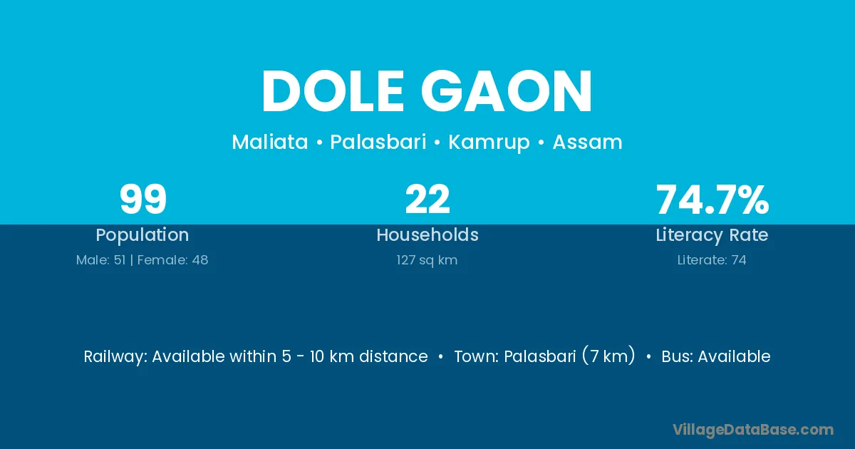 Palasbari (7 km) is the nearest town to Dole Gaon village for major economic activities and is located approximately 7 km away.