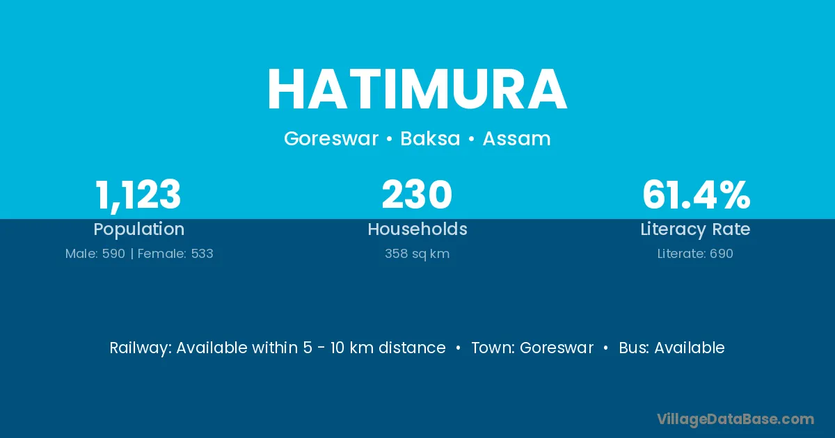 Guwahati (30 km) is the nearest town to Hatimura village for major economic activities and is located approximately 30 km away.