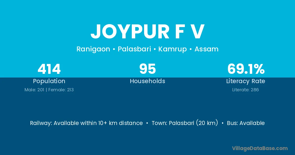 Palasbari (20 km) is the nearest town to Joypur F V village for major economic activities and is located approximately 20 km away.