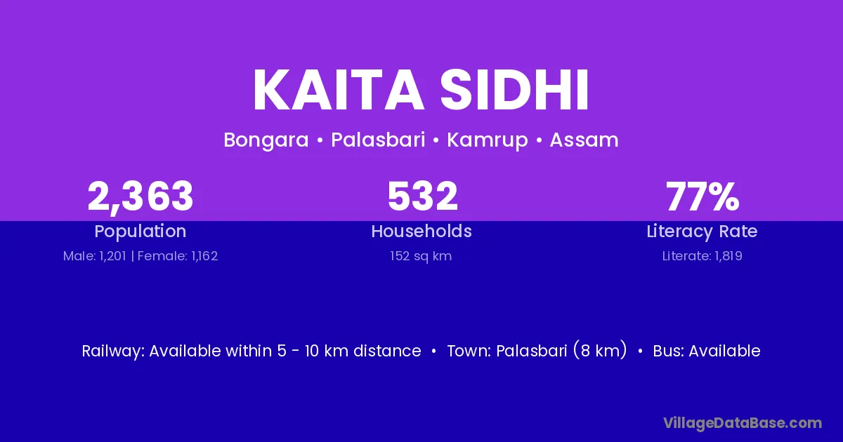 Palasbari (8 km) is the nearest town to Kaita Sidhi village for major economic activities and is located approximately 8 km away.