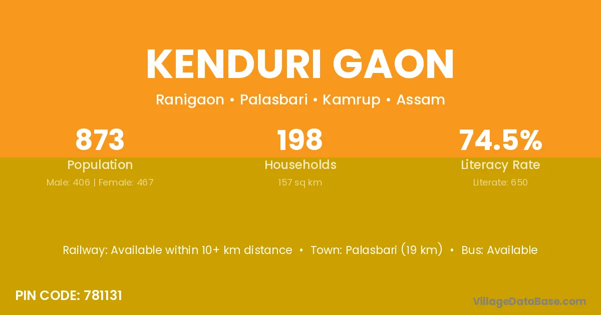 Palasbari (19 km) is the nearest town to Kenduri Gaon village for major economic activities and is located approximately 19 km away.